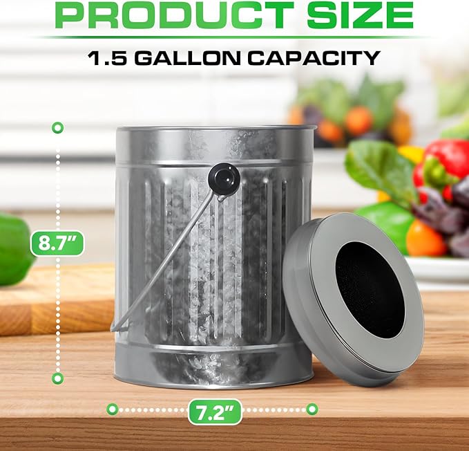 - 1.5-gallon (5.68 liters) Capacity: This kitchen compost container makes it an excellent choice for managing food waste efficiently, catering to a variety of household composting needs. Ideal for collecting food scraps like fruit peels, vegetable trimmings, coffee grounds, and eggshells.