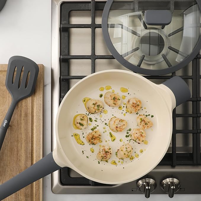 - EASY-RELEASE CERAMIC NONSTICK INTERIOR: Perfect for making new and traditional recipes, this set of pots and pans features a ceramic nonstick interior made without PFOA, PTFE, lead or cadmium. The ceramic coating has an easy-release finish to help prevent leaving crumbs or residue for easier cleanup.
