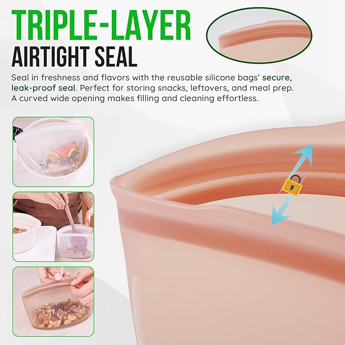 - Triple-Layer Airtight Seal: Seal in freshness and flavors with the reusable silicone bags’ secure, leak-proof seal- perfect for storing snacks, leftovers, and meal prep. A curved wide opening makes filling and cleaning effortless