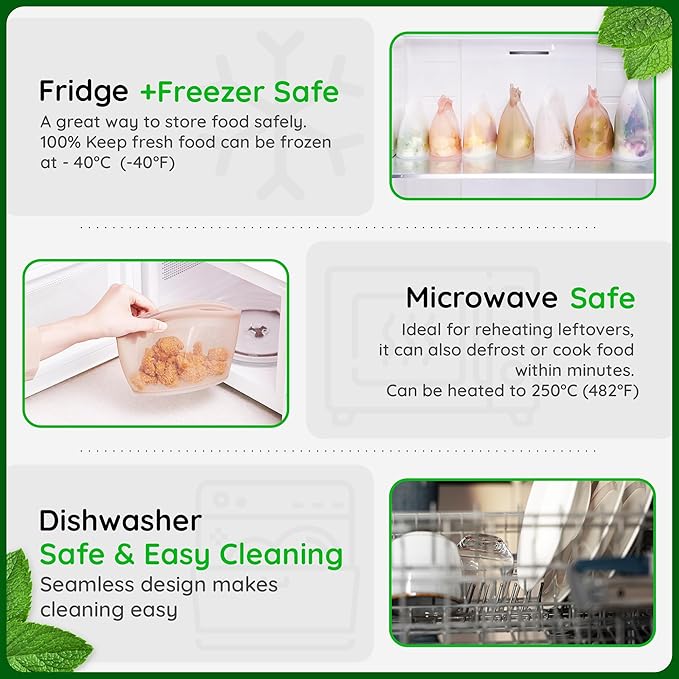 - Temperature Resistant: These silicone food storage bags are safe for the freezer, microwave, boiling water, and dishwasher, plus, a sturdy flat base keeps our food storage containers upright