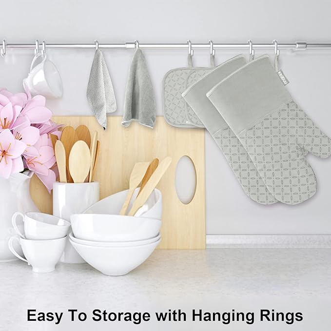- EASY TO STORE: The kitchen oven mitts and pot holder come with rope design, so it is easy to store and hang them via the suspension rings when you are not using, save your room and make your kitchen look more cleaner