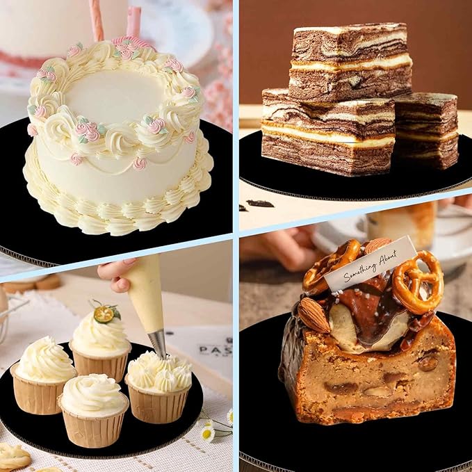 - 【Anti-Oil and Anti-Slip】The cake board has two sides: one side is coated with a shiny surface to prevent the round plate from absorbing oil and moisture; the other side is a matte surface to increase friction and prevent the cake slipping from your hands when moving it. Please note that the shiny surface of cake board is the one that touches the cake.