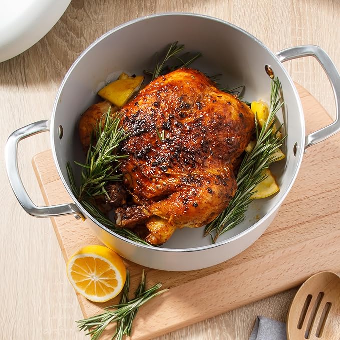 Sur La Table Kitchen Essentials Potluck Porch 10 Piece PFA Free Ceramic Non stick Interior Forged Aluminum Cookware Pots and Pans Set W/Aluminum Lids - Linen White - Induction Compatible