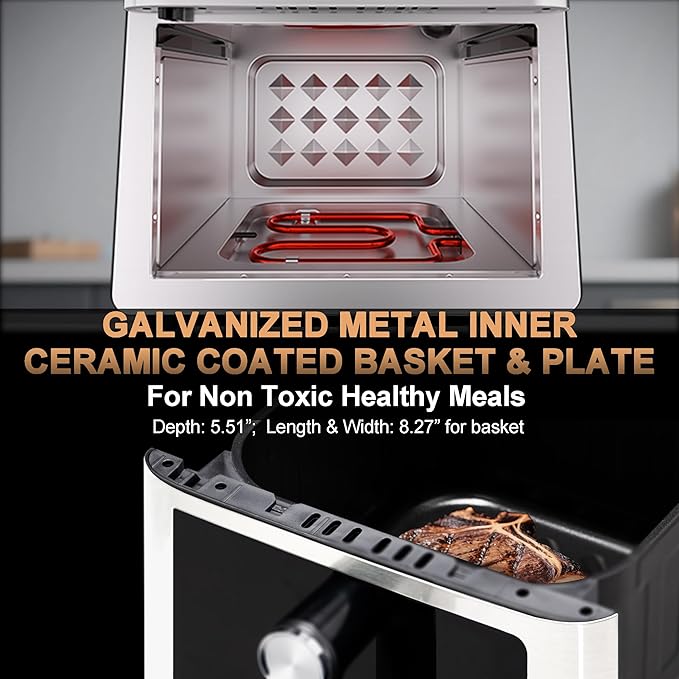 - ๐. ๐๐ซ๐๐ฆ๐ข๐ฎ๐ฆ ๐๐ญ๐๐ข๐ง๐ฅ๐๐ฌ๐ฌ ๐๐ญ๐๐๐ฅ & ๐๐๐ญ๐๐ฅ ๐๐ฎ๐ข๐ฅ๐ - Odorless air fryer in steel metal construction eliminates plastic smells and overheating risks (after well cleaning). Commercial-grade stainless exterior and food-grade galvanized metal interior ensures durability and consistent heating for safer family meals (Note: there are two PPS protective glide rails in the interior to protect the ceramic coating. Temperature resistant up to 553ยฐF)