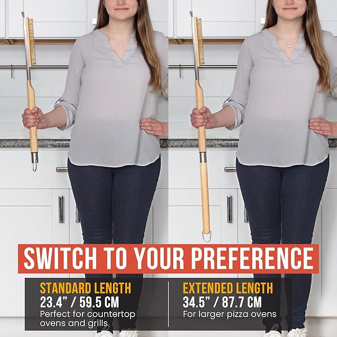 - VERSATILE USE: Compatible with all oven types, from solo pizza oven accessories to indoor ovens, outdoor ovens, grills, and pizza stones with handles for oven setups. This brush is an all-in-one solution for pizza oven accessories for outside and indoor use.