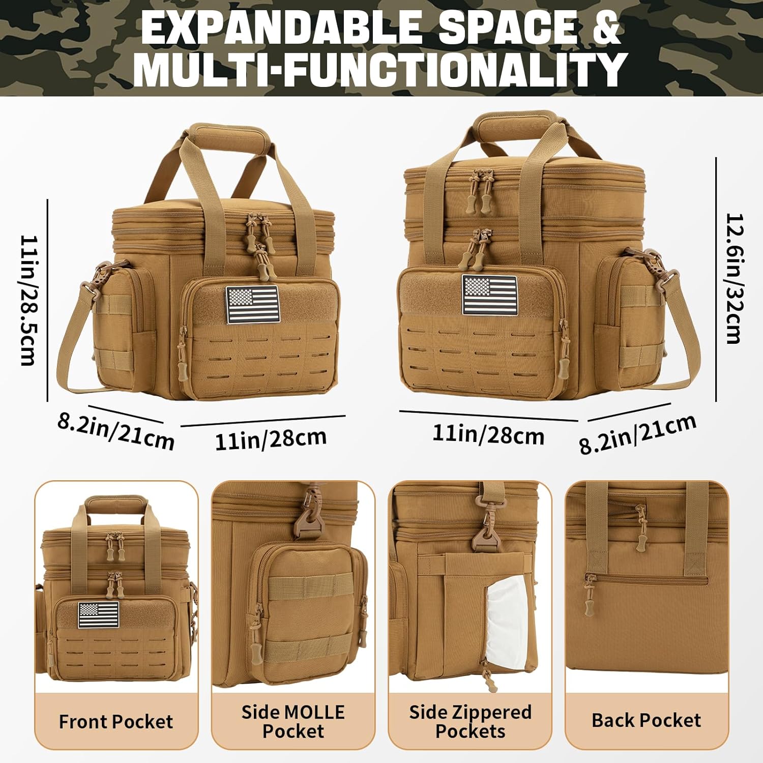 QT&QY Tactical Lunch Box for Men Expandable 18L Heavy Duty Military Insulated Cooler Bag, Leakproof Thermal Lunch Bag for Work Camping Outdoor Picnic Pail Adult Meal MOLLE Webbing Khaki