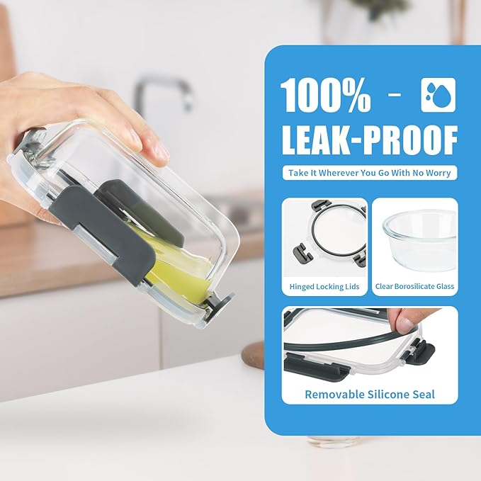 - 【100% Leak Proof Airtight Lid】Glass food containers is designed with removable silicone seals and 4-hinge snap locks to ensure zero leaking or spilling, which also prevent smell go out and keep food fresh.