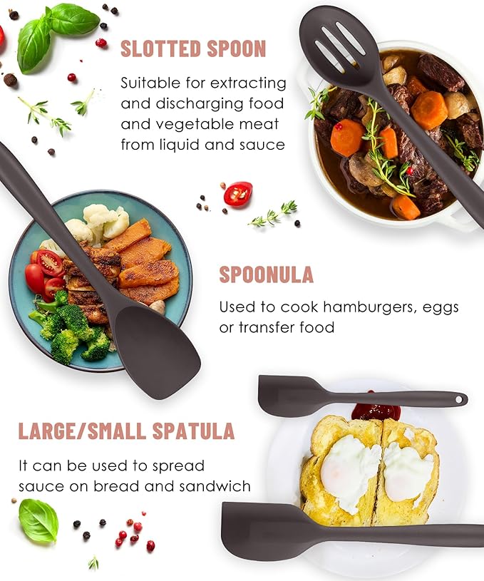- ❤【Food Grade Safe Silicone】Odorless food-grade silicone each utensil is made of food-grade silicone, can use in any type of food.A set of excellent cooking utensils is related to the health of you and your family, so we choose stricter materials and quality inspection. Tips We recommend soaking them for half an hour before first use, and then exposing them to air for about 3 hours to eliminate the original odor.
