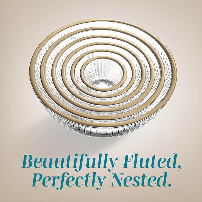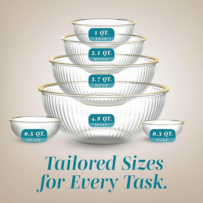 - Complete 12-Piece Set: Includes 6 glass mixing bowls with a gold rim and 6 airtight lids – perfect for food storage, meal prep, and serving all in one. The set includes bowls with capacities of 26.72 oz, 36.85 oz, 53.25 oz, 70.67 oz, 92.66 oz, and 149.85 oz, all made from high borosilicate clear glass with colored lids.