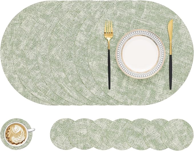 homing Round Faux Leather Placemat and Coaster 8 Packs, Washable Heat Resistant Dining Place Mats, Wipeable Double-Sided Table Mats for Indoor and Outdoor, Diameter 13 and 3.93 inch, Light Green