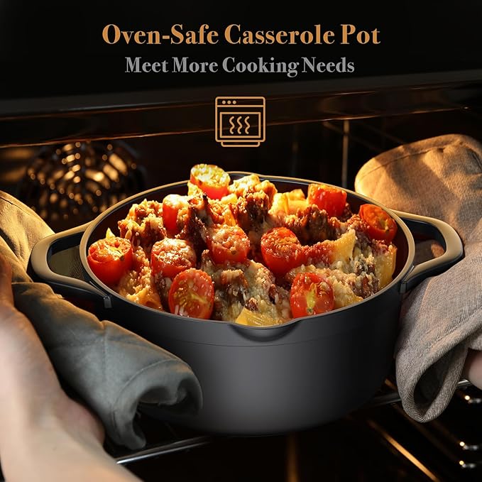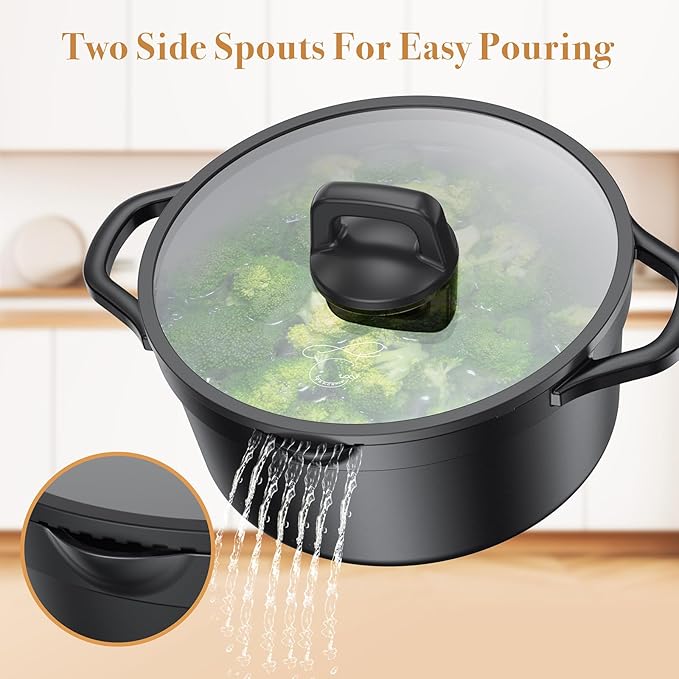 - Dual Pour Spouts: Say goodbye to messy spills! Our nonstick pots and pans feature two precision spouts for effortless, drip-free pouring—whether it’s sauces, soups, or excess oil. Designed for both lefties and righties, because everyone deserves a smooth pour!