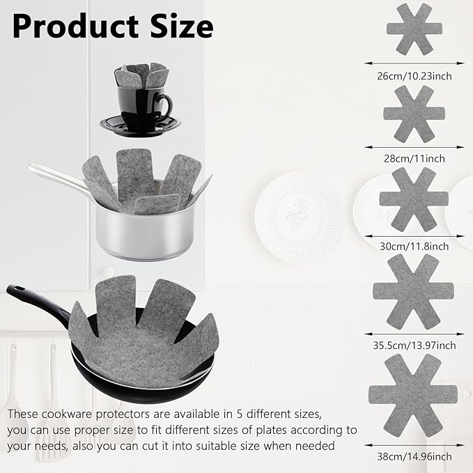 - Assorted Sizes: these cookware protectors are available in 5 different sizes, the diameters are 14.96 inches/ 38 cm, 13.97 inches/ 35.5 cm, 11.8 inches/ 30 cm, 11 inches/ 28 cm and 10.23 inches/ 26 cm, you can use proper size to fit different sizes of plates according to your needs, also you can cut it into suitable size when needed