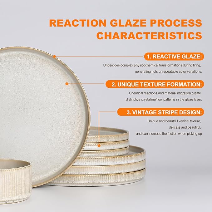 - Unique Dual Reactive Glaze & Retro Stripes:The dishes set for 4 featuring a one-of-a-kind dual reactive glaze surface and handcrafted vintage stripe design, each piece boasts unpredictable color variations and artistic depth, transforming your table into a gallery of natural elegance. Perfect for adding rustic charm to modern dining