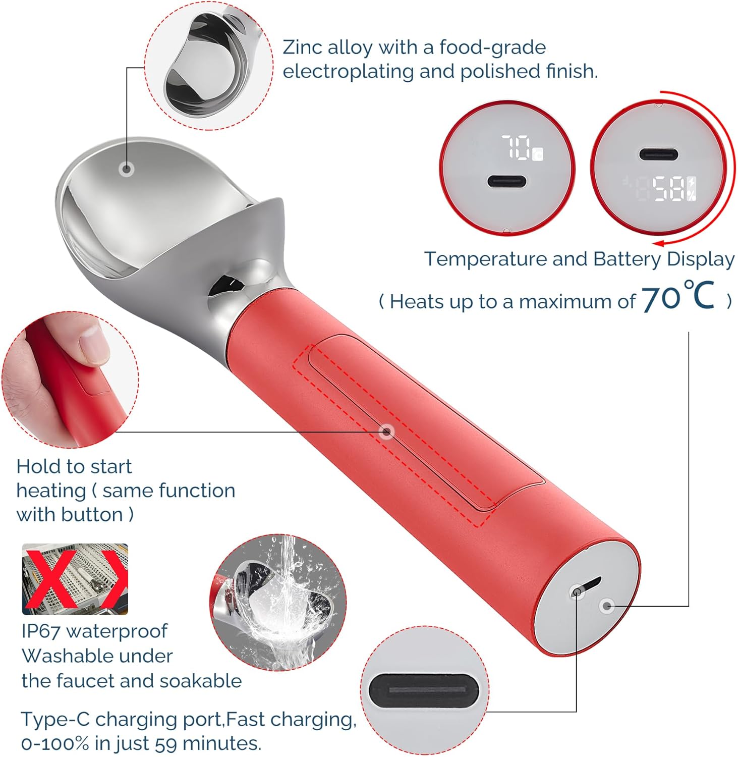 - [USB Rechargeable & Waterproof] – Features a long-lasting USB rechargeable battery, so you can use it cordlessly anywhere – no cords or disposable batteries needed. A single charge powers dozens of scoops so it’s always ready for dessert time. Built with heavy-duty food-grade metal and an IP67 waterproof body for easy cleaning under running water (fully washable without damage). This durable, professional-quality heated scoop is built to last for countless scooping sessions