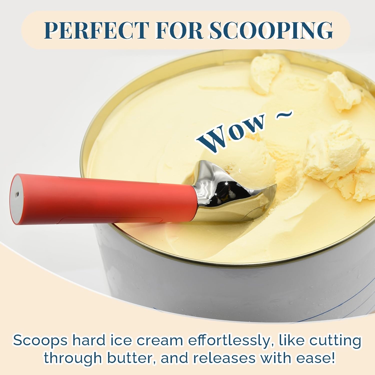 - [Effortless Hard Ice Cream Scooping] – No more bending spoons or waiting for ice cream to thaw. This heated ice cream scoop warms up quickly to 158°F, letting you glide through even rock-solid ice cream straight from the freezer. Just grip the handle to activate heating — no buttons required. It continues warming for 40 seconds after use, making every scoop smooth and simple. Perfect for ice cream, gelato, or frozen yogurt