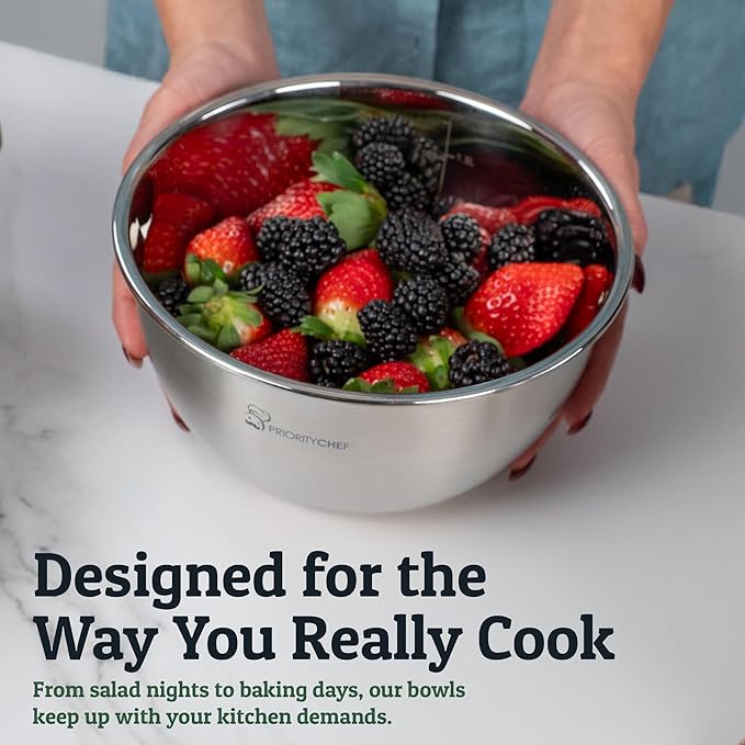 - The Ultimate Stainless Steel Mixing Bowl Set for Daily Prep - This 5-piece set is your go-to for everyday cooking, from tossing salads to whipping up pancakes. Made with premium stainless steel, each bowl includes inner measurement markings and a non-slip base to simplify every step. Whether you're prepping family meals or organizing a busy kitchen, this set helps you stay efficient, tidy, and stress-free.