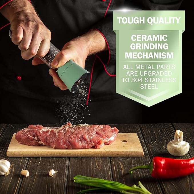 - High Quality Glass - Modern Green Stainless Steel Salt and Pepper Mill Set : Home EC Salt and Pepper Mills are easy to grip and made of the highest grade non-corrosive, Stainless Steel, and BPA Free glass bottle. This salt grinder and pepper grinder set is a modern, classy and user friendly addition to your kitchen accessories. Perfect for a gourmet meal or dinner party. Great gift or party favor! *Salt and Pepper Not Included.
