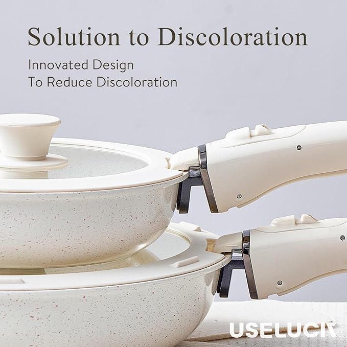 - 【Detachable Handle Cookware for Easy Storage】Our cookware with removable handles offers great convenience, allowing for compact storage. Whether you're at home or on the go, this detachable handle pots and pans set is easy to store in cabinets or RVs. The unique locking system ensures nonstick detachable pans stay securely in place