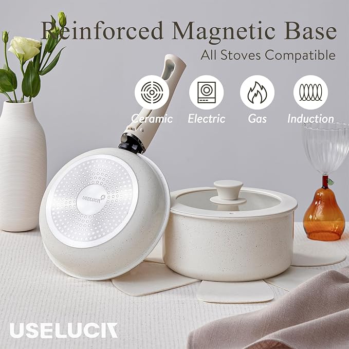 - 【Healthy Cookware Set 】: Featuring a 100% recyclable aluminum core and eco-friendly packaging (85% recycled cardboard), it helps reduce environmental impact. Our kitchen cookware set’s coating is made from natural ceramic, free from Teflon, PFAS, PTFE, PFOA, lead, or cadmium, and does not release toxic fumes, making it safe for baby food and sensitive diets. Every meal matters. Our cookware is your family's first line of defense, guarding health from breakfast eggs to dinner stews.