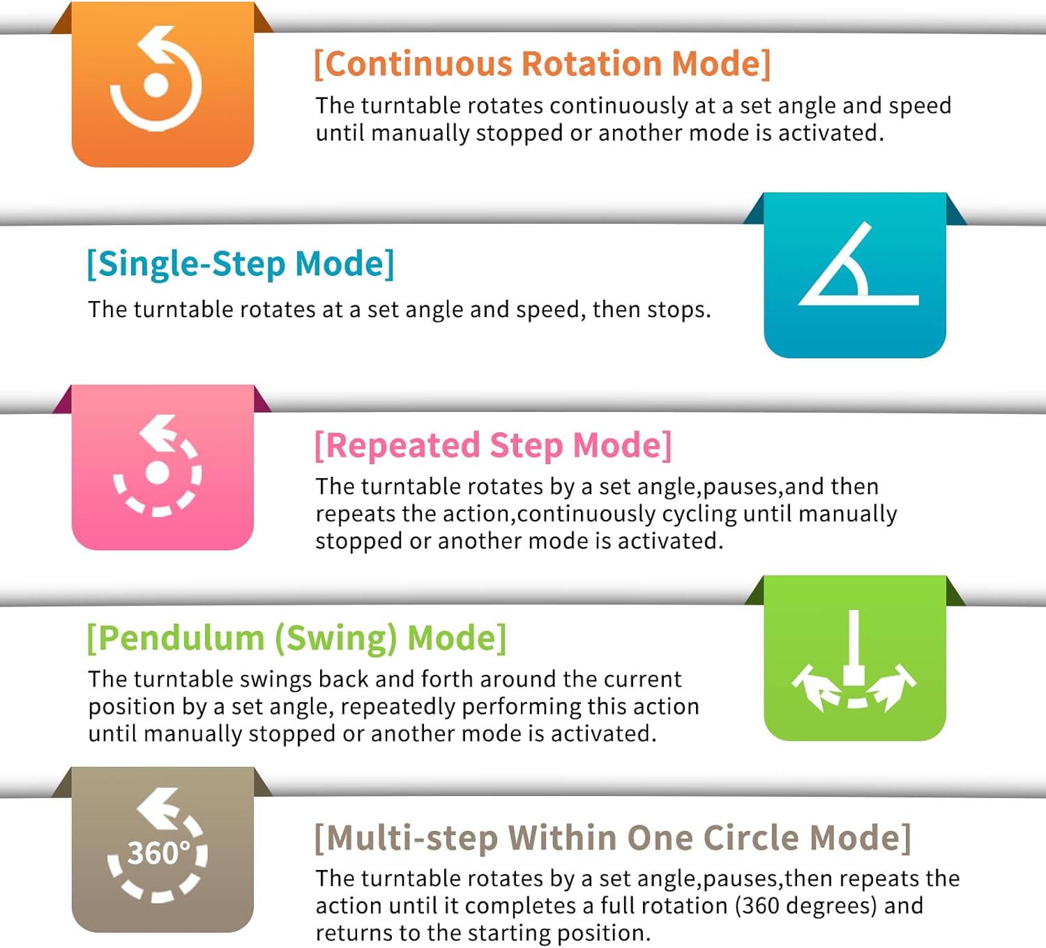 - Special Feature : Five rotation modes, High-Precision stepper turntable, Multi-step Within One Circle Mode, Pendulum (Swing) Mode, Set the current position and return to the position Five rotation modes, High-Precision stepper turntable, Multi-step Within One Circle Mode, Pendulum (Swing) Mode, Set the current position and return to the position