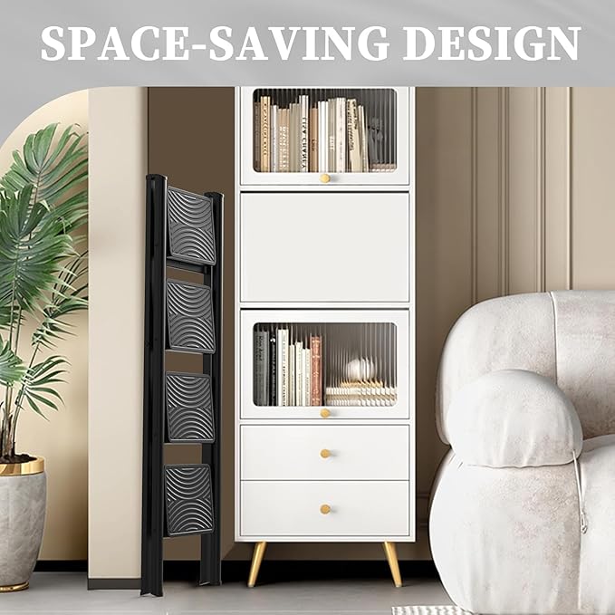 - SPACE SAVING:Save space with our 4-step ladder, folding down to a mere 2.6'' width, making it easy to store in tight corners, against walls, or under beds and cabinets.