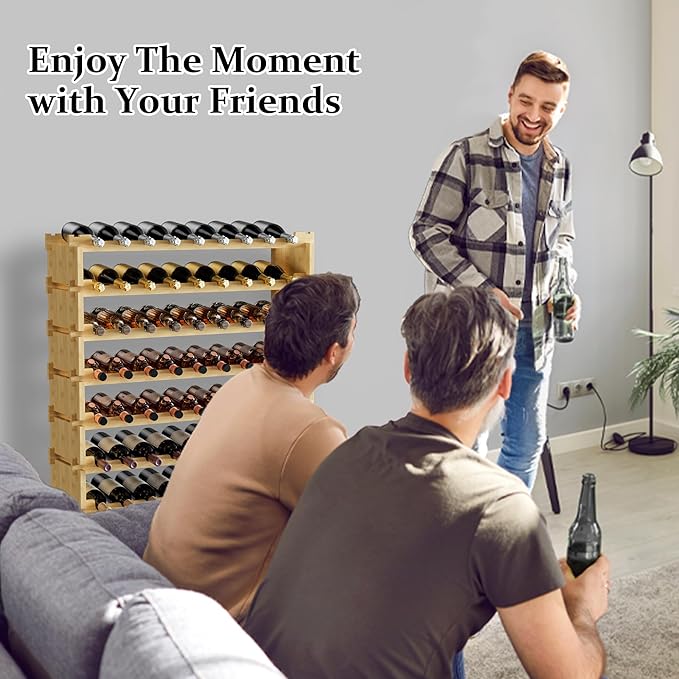 - 【Large Capacity Wine Rack】 Bambloom wine rack meets all the needs of your home wine bottles storage make your 'wine area' more tidy and wine collection accessible without taking a lot of space. Each wine rack tier can store 9 bottles of wine, 8-Tiers compact design allows it to hold 72 wine bottles. It is highly versatile and makes an excellent gift for wine enthusiasts and collectors. Please note, wine is not included.
