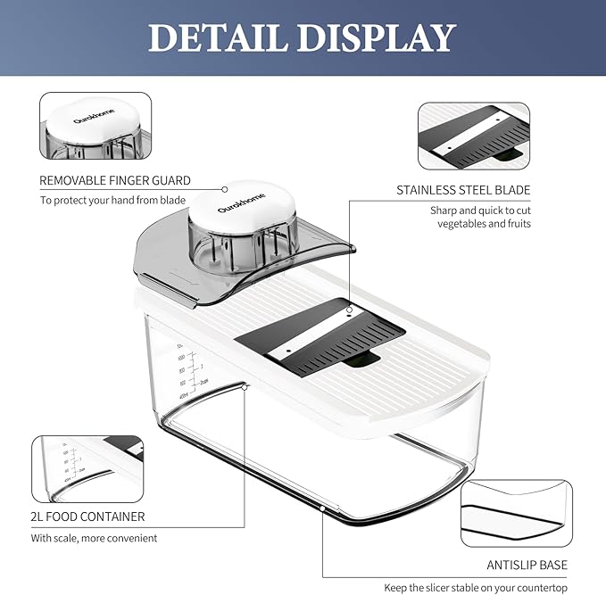 - An innovative mandolin slicer that will make you addicted to chopping: It is equipped with 6 interchangeable razor-sharp blades for effortless ingredient preparation. The expanded hand guard ensures the safety of your fingers, while its detachable design facilitates easy cleaning. The food collect container of the vegetable slicer features a scale for precise measurement of ingredients, and has been reinforced to enhance overall durability