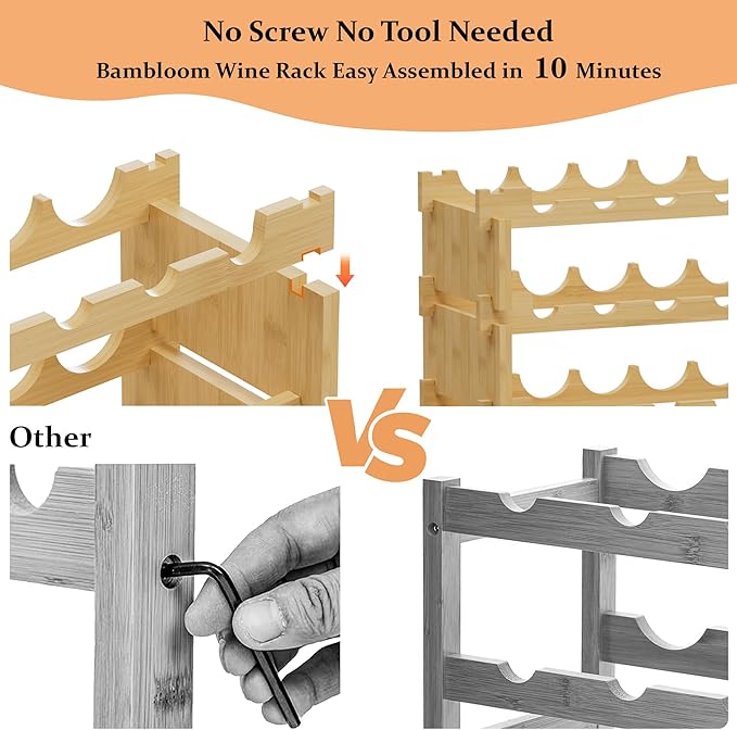 - 【Easy Assembly & No Tools Needed】This freestanding floor wine rack with a sturdy and stable design. With no nails or screws required, it assembles in minutes, providing an effortless setup for your wine bottle rack.