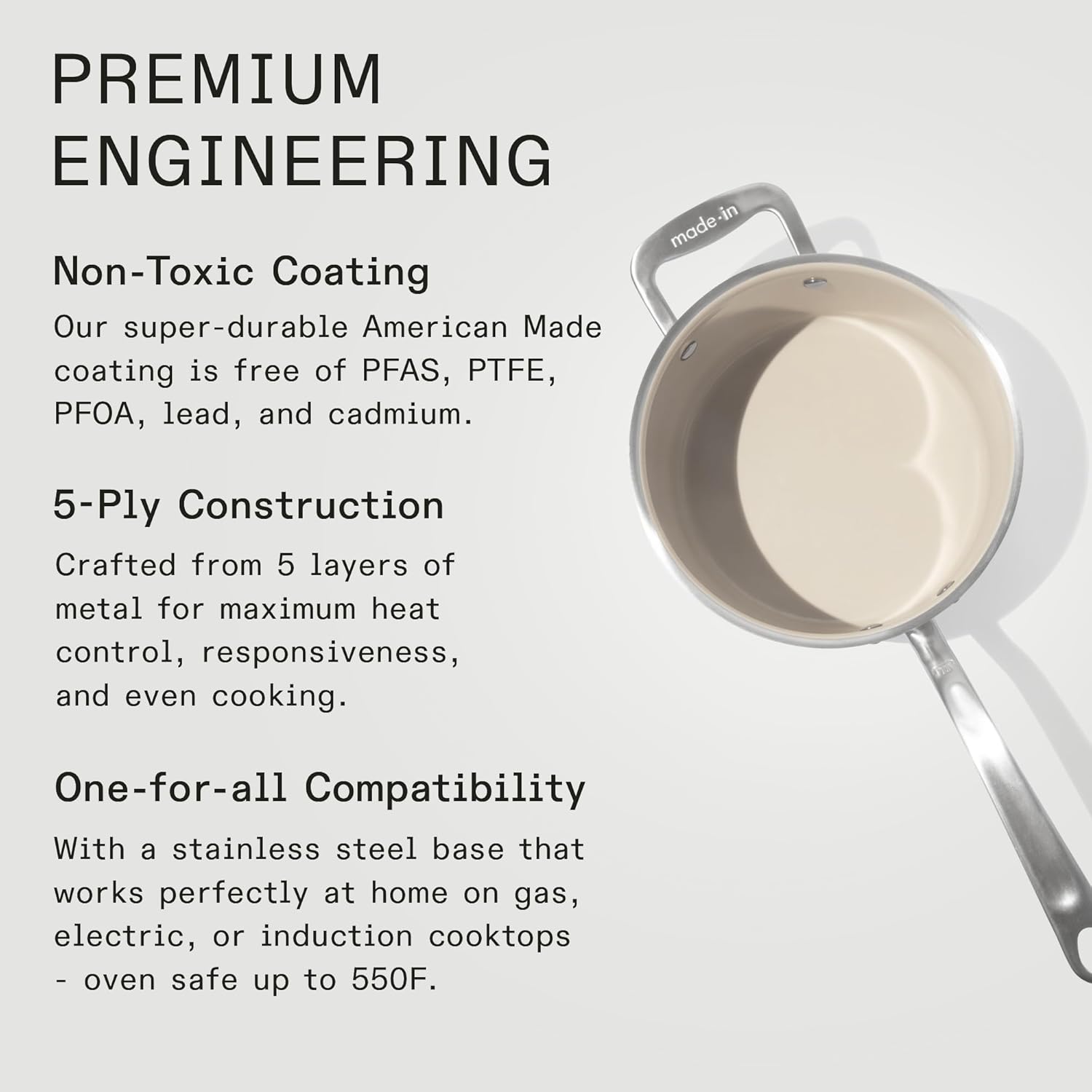 Made In Cookware - 4 QT Ceramic Non Stick Saucepan with Lid - 5-Ply Stainless Clad with Stay-Cool Handle - Professional Cookware - Crafted in Italy - Induction Compatible