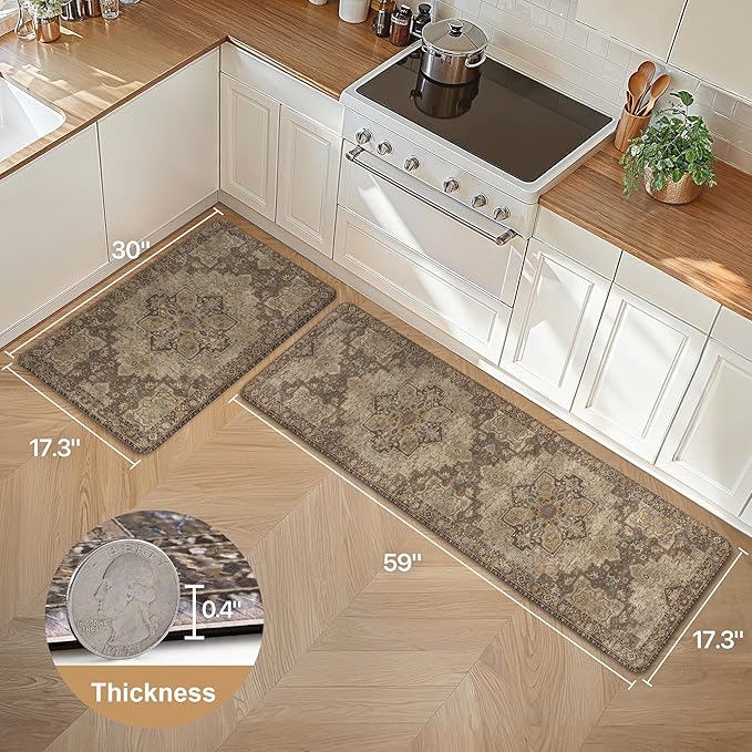 GENIMO Kitchen Mats for Floor 2PCs, Washable Anti Fatigue Mat for Cushioned, 17.3"x59"+17.3"x30", Waterproof Kitchen Rugs, Non Slip Comfort Standing Mat Rug for Home, Sink, Laundry, Rustic Brown