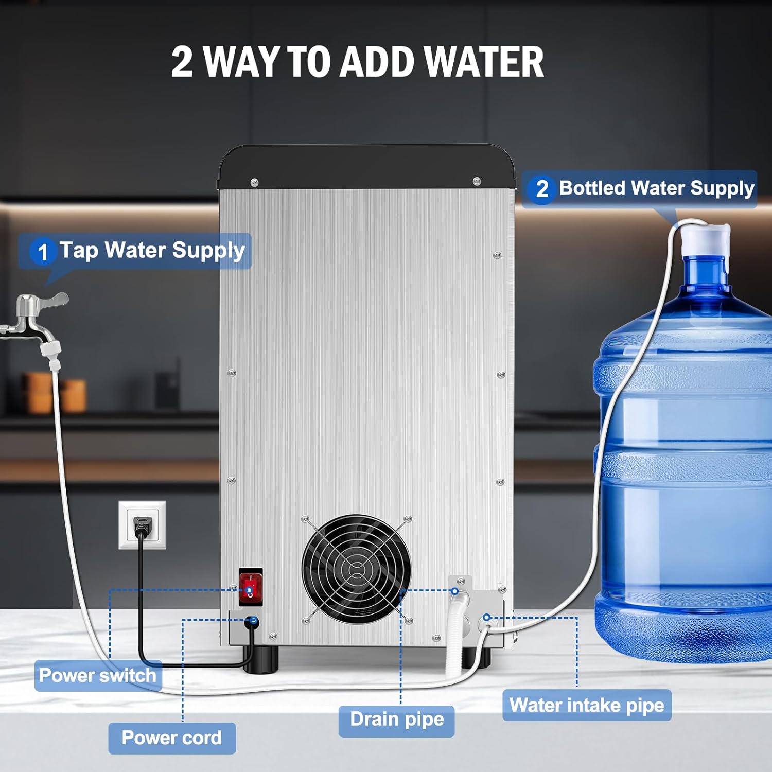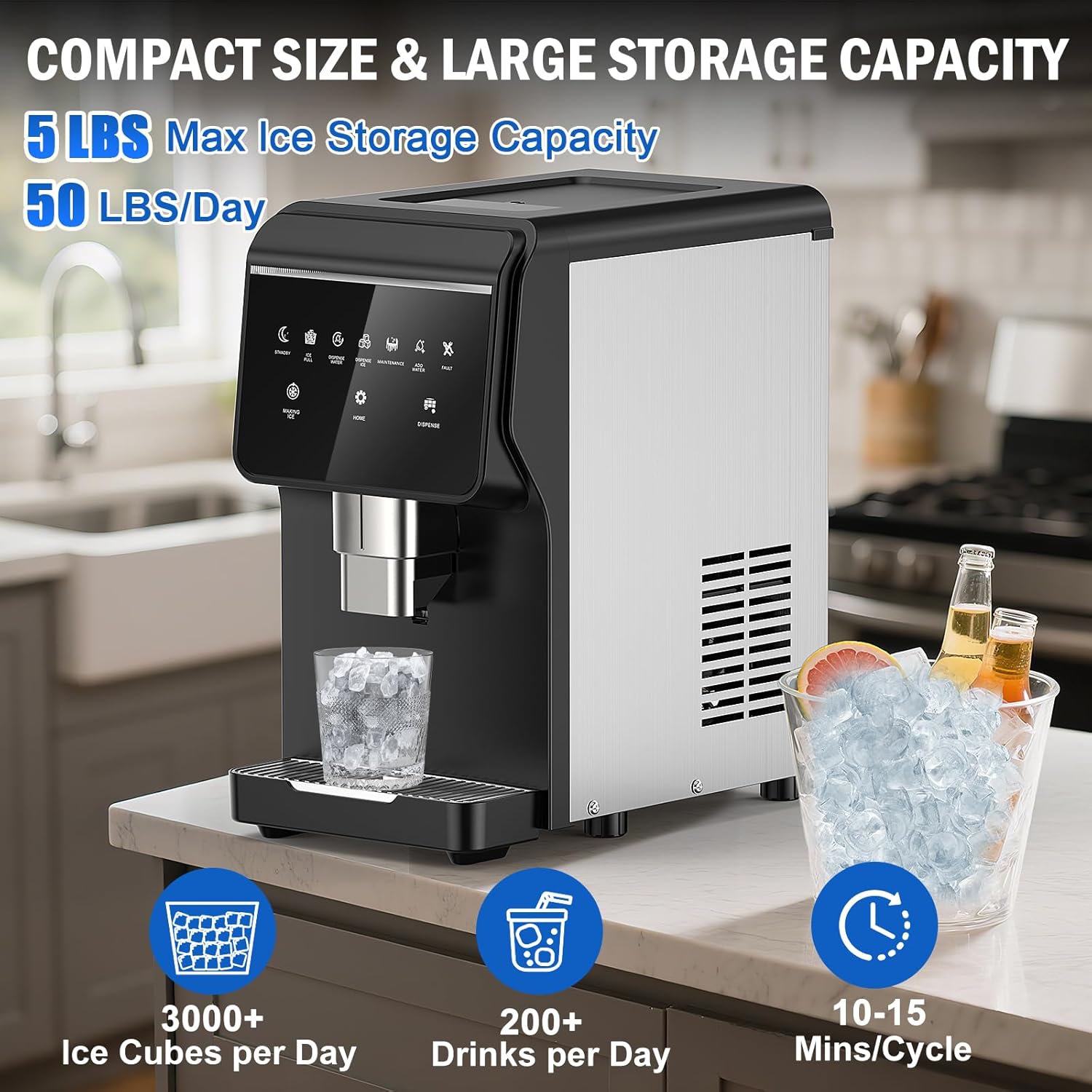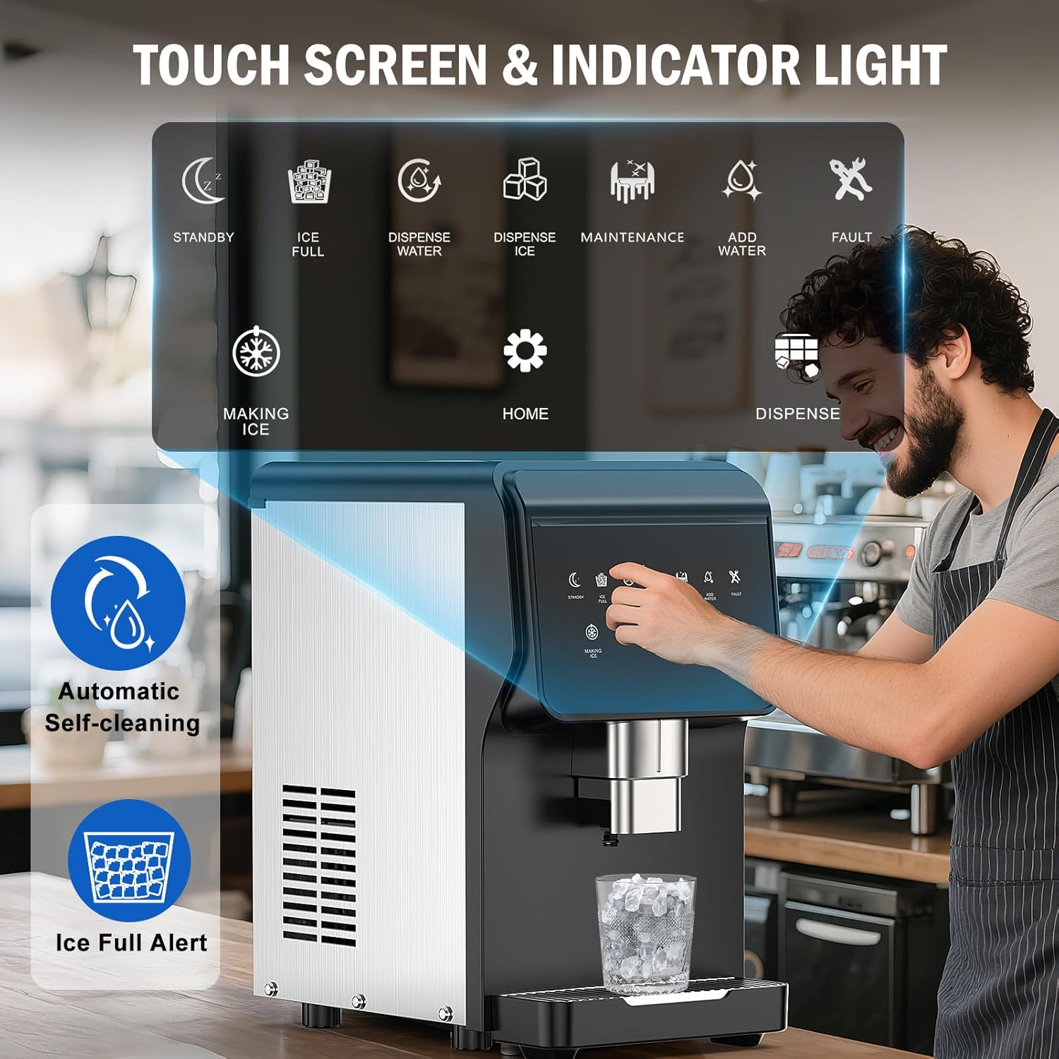 - SMART CONTROLS & INDICATOR LIGHTS: Designed with a user-friendly control panel, this ice maker machine allows you to select from water, ice, or ice water functions. You can also set the desired quantity and timer. It features one-touch automatic cleaning and intuitive indicator lights for ease of use.