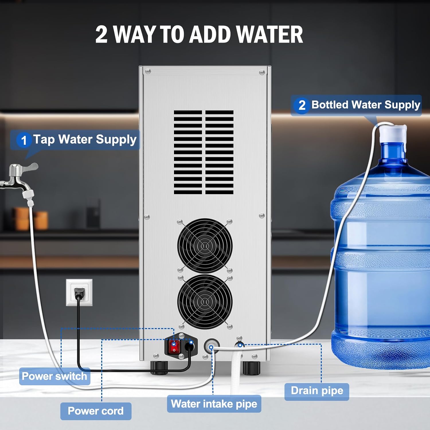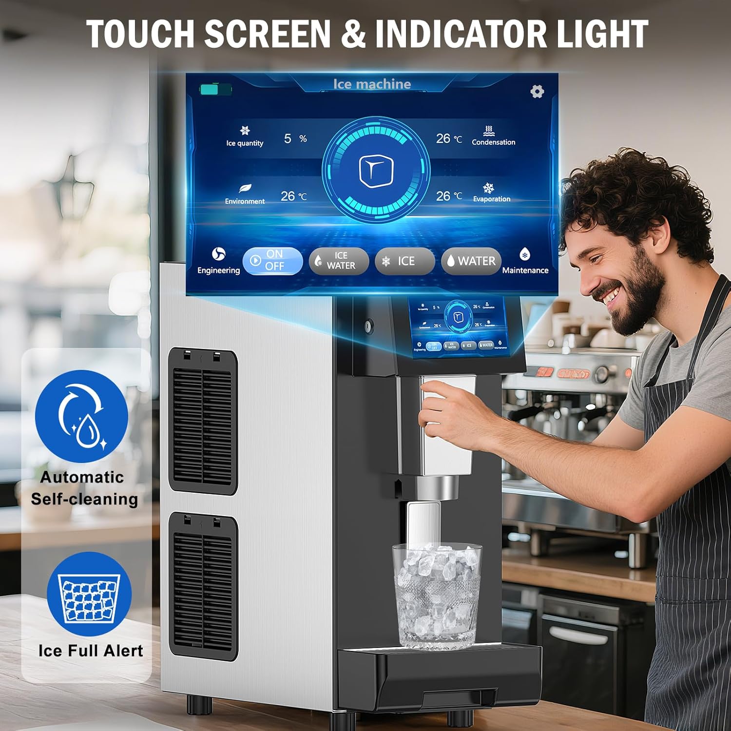 - SMART CONTROLS & INDICATOR LIGHTS: Designed with a user-friendly control panel, this ice maker machine allows you to select from water, ice, or ice water functions. You can also set the desired quantity and timer. It features one-touch automatic cleaning and intuitive indicator lights for ease of use.