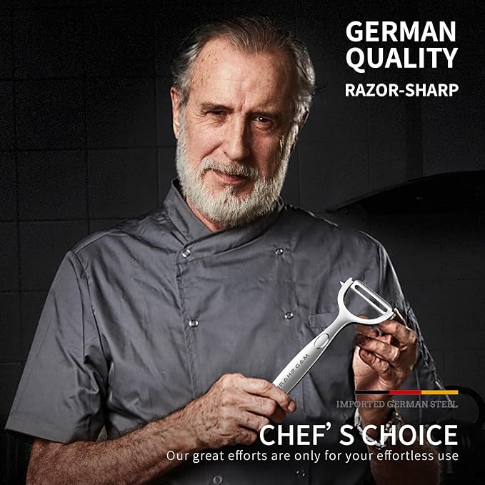- TOP GRADE HIGH-QUALITY MATERIAL: This rust-free potato peeler features a premium 304 stainless-steel blade that stays ultra-sharp, ensuring effortless peeling every time. Built to last, this durable peeler can withstand extensive use without dulling, breaking, or discoloring, providing reliable performance for all your kitchen peeling needs
