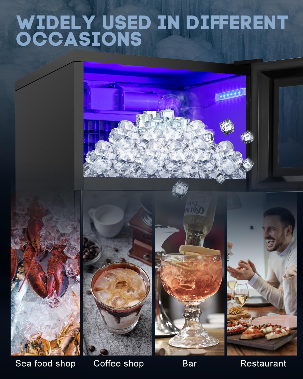 - Rapid Ice Production & High Capacity:Our upgraded commercial ice maker features a powerful compressor that produces 45 clear ice cubes in just 10 to 20 minutes, generating up to 130 lbs of ice daily. With a spacious 35 lbs storage bin, it’s perfect for both home and commercial use.