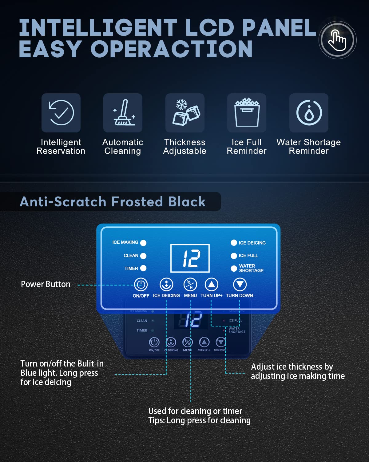 - Intuitive LCD Control Panel:Easily manage all functions via the smart LCD panel, which includes a 24-hour reservation, automatic self-cleaning, de-icing, built-in blue light, and malfunction indicators. Adjust ice-making time with a simple press of the (+) or (-) buttons to customize ice size.