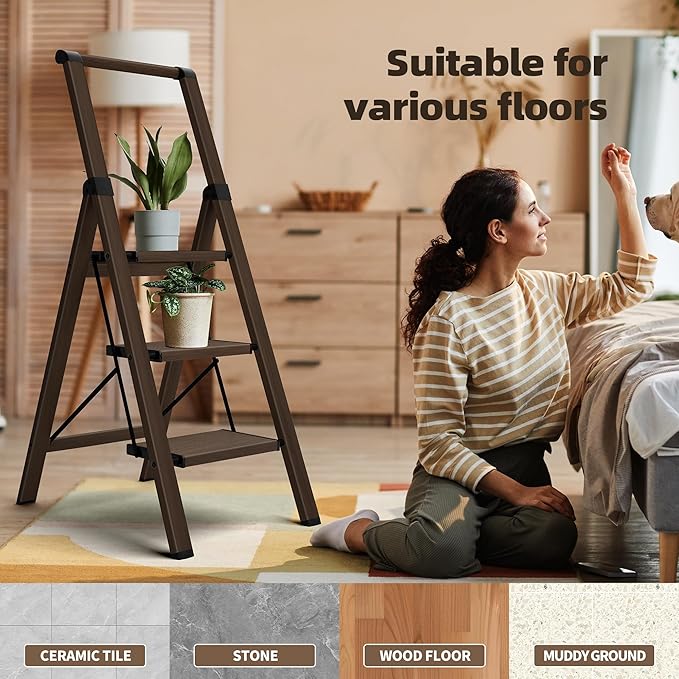 HillhutApex 3 Step Foldable Aluminum Step Ladder with Handgrip, Anti-Slip Pedal, 330lbs Capacity, Lightweight & Portable for Home, Kitchen, Office, Garage (Walnut)