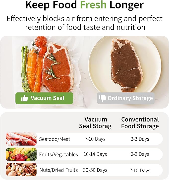 - ๐๐ผ๐ป๐ด-๐๐ฎ๐๐๐ถ๐ป๐ด ๐๐ฟ๐ฒ๐๐ต๐ป๐ฒ๐๐: Say goodbye to food waste! By removing air and preventing freezer burn, this vacuum sealer extends shelf life while keeping flavors, textures, and nutrients intact. Enjoy fresher, healthier meals for longer.