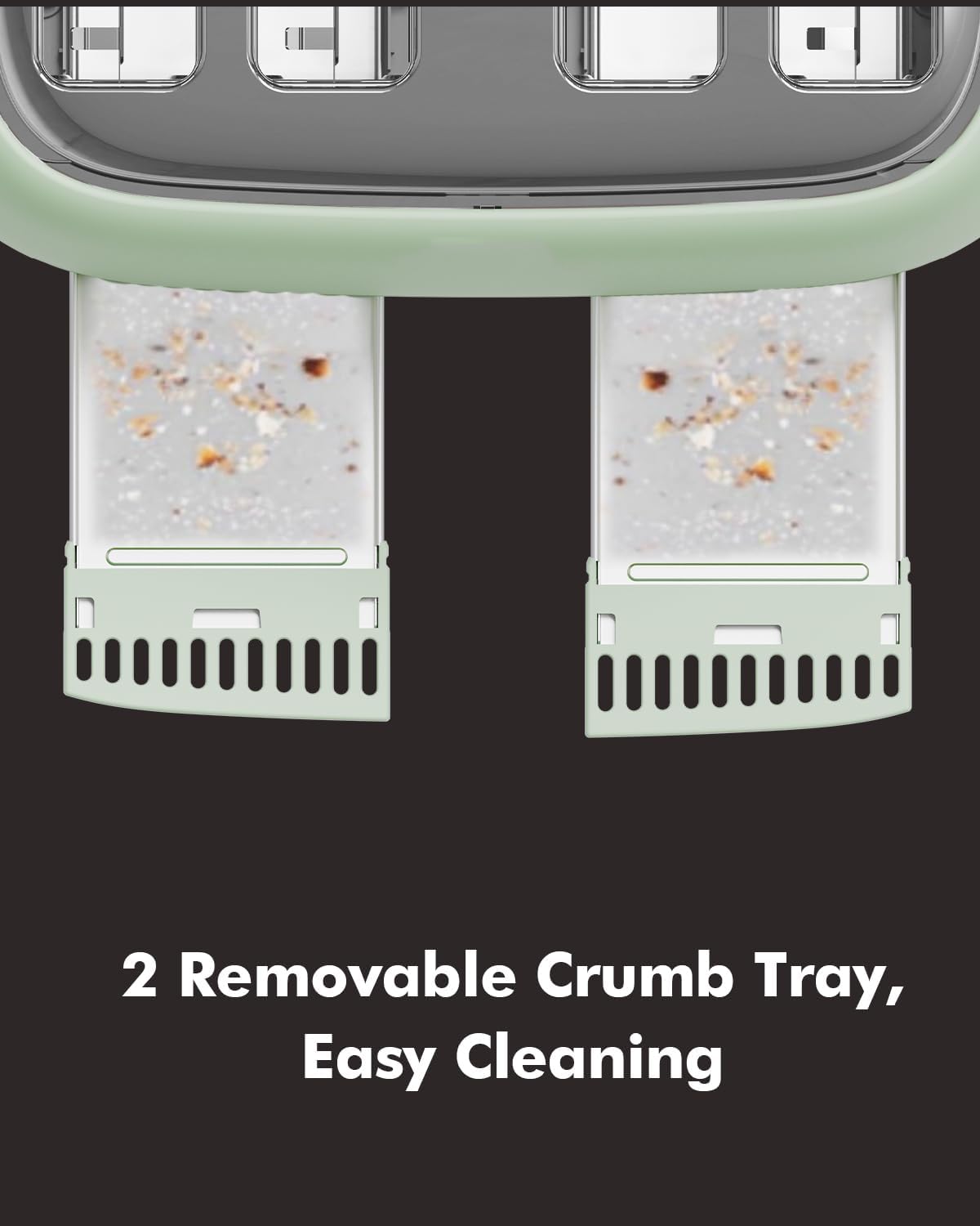 Retro 4-Slice Toaster 1.6" Wide Slots - 6 Toast Settings with Bagel Function, Stainless Steel Body, Defrost/Cancel Button & Crumb Tray, Vintage Green