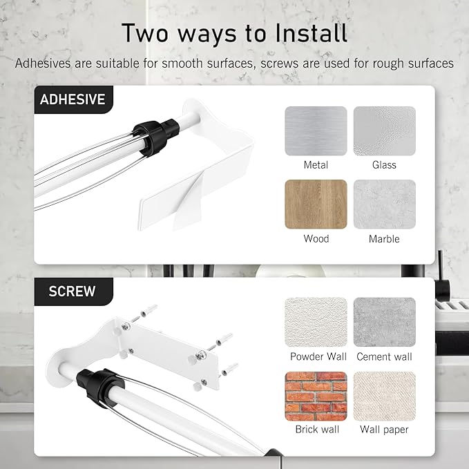 - EASY INSTALLATION: This under cabinet paper towel holder supports two ways of installation, Adhesive or Screw. You can choose the appropriate way according to the condition of the target installation location