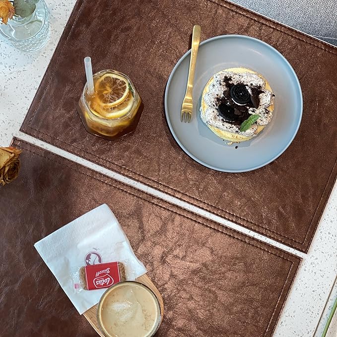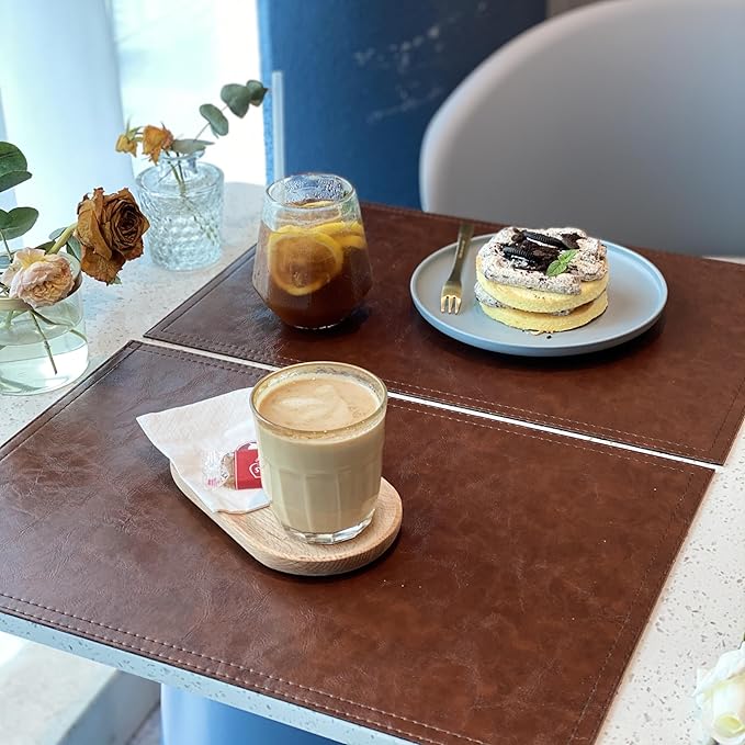 Jovono Waterproof PU Placemats, Faux Leather Dining Table Mat, Set of 8, Easy to Wipe Off Scrub Vinyl Mat, Heat & Stain Resistant for Office Conference Table, Home Décor Brown