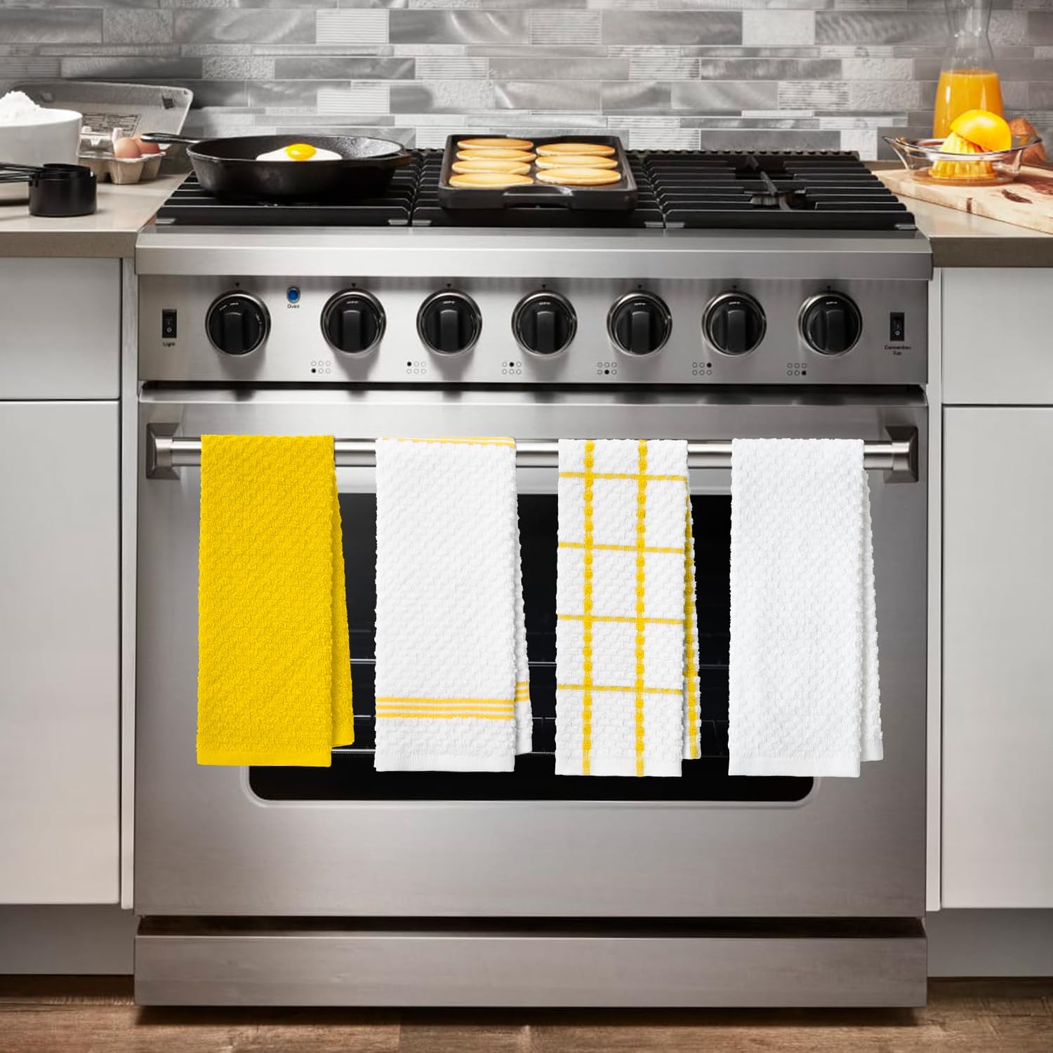 - VALUE PACK: Collection includes 4 cotton kitchen towels available in a variety of colors to coordinate with any kitchen décor. Measures 15 in x 25 in.