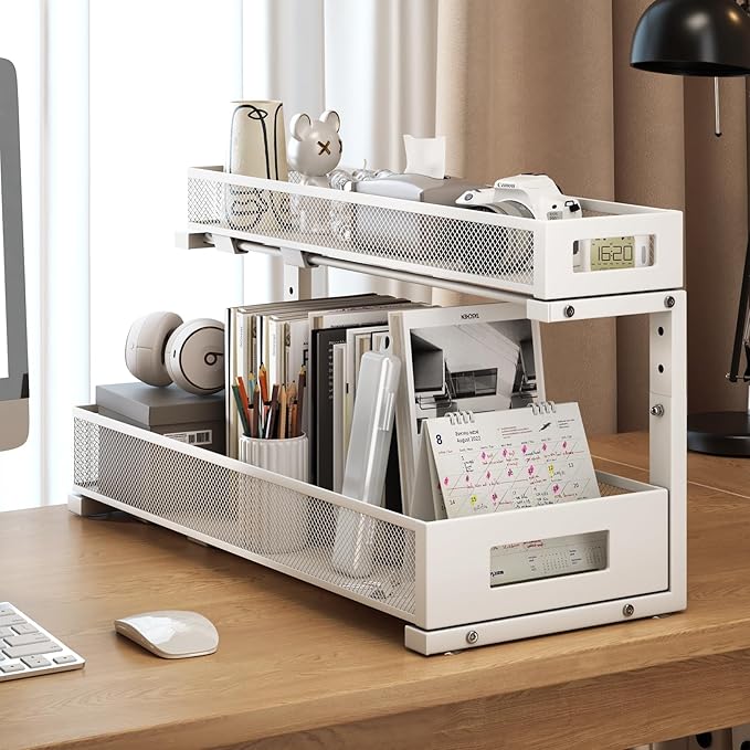 - 【2-Tier Pull-Out Design for Easy Access】This under-sink organizer features a double-layer pull-out design, allowing you to easily access items at the deepest part. The upgraded, thickened iron circular sliding rails ensure a smooth and seamless pulling experience, making each use effortless. The unique pull-out locking mechanism effectively prevents the drawers from being completely pulled out, avoiding the risk of items falling or structural damage caused by over-pulling, ensuring safer and more convenient use.