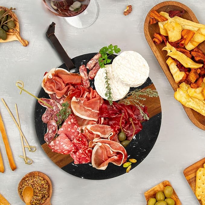 - Premium Quality & Size: Made from smooth black marble and warm acacia wood, this cheese board measures 12" in diameter and 0.5" thick for a durable, elevated presentation surface.