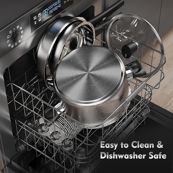 - 【DISHWASHER SAFE】The cooking set is dishwasher safe for easy and convenient cleaning, and the food-grade stainless steel that is durable, rust-proof, and corrosion-resistant. After cleaning, it is recommended to wipe dry with a soft towel and place the pot in a dry and ventilated place.