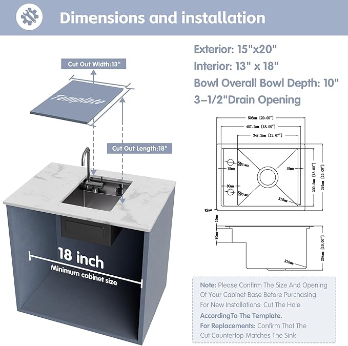 - Product Size and Package Includes: exterior dimensions: 15" (wide) x 20" (front-to-back), bowl depth: 10", interior bowl dimension: 13" (wide) x 18" (front-to-back) | Minimum Base Cabinet: 18", recommend cutout size: 13" W ( from left to right )x 18"L (front to back ). 3.5 inch sink drain opening fits standard garbage disposal unit in the US. Package with 15" x 20"hidden bar sink, cutting board, folding faucet, soap dispenser strainer and stainless steel bottom grid, mounting clips, cut out template and installation manual