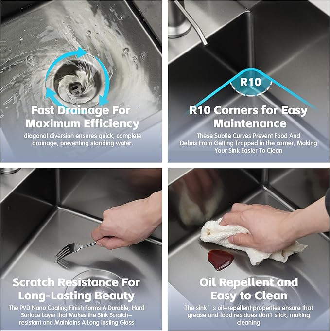 - Fast Drainage and Easy to Clean: the bottom of this stainless steel undermount bar sink is designed sloping bottom and has X water guideline is easier to water drainage and prevent water from staying in the sink, keep sink dry. R10 round corner is easier to clean and maintenance