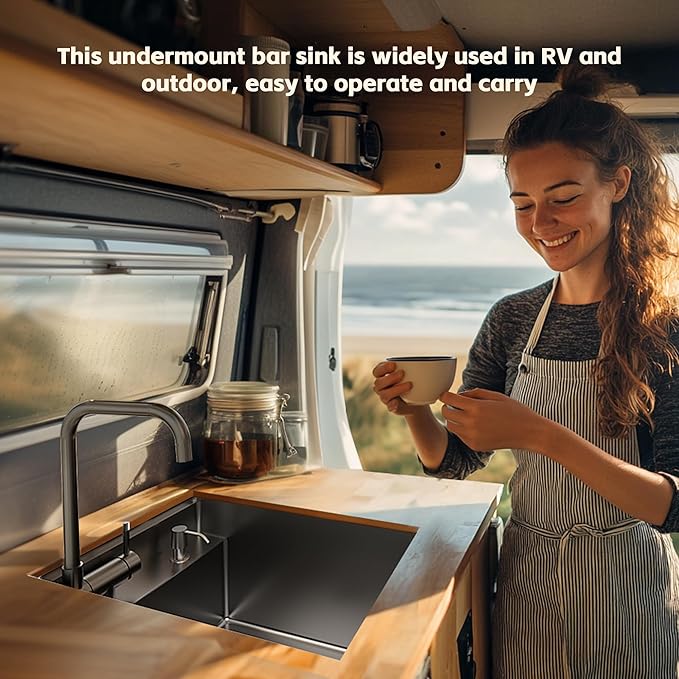 - Unique Design: this small bar single bowl RV sink with integrated ledges and cutting board that make it easy for you to wash and cut food and fruit. If you want a flat countertop, the sink can be transformed into a flat platform in seconds, saving space in your kitchen. It is applicable to laundry room, RV, outdoor, coffee bar area, patiogourmet kitchen, small kitchen and so on