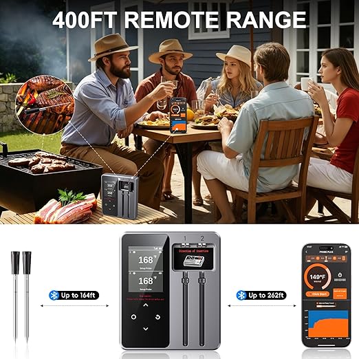- Wireless Meat Thermometer with Bluetooth Technology: Monitor cooking temperatures up to 400 feet away without tangled wires. Easily track progress on large-screen display or phone for simpler cooking experience