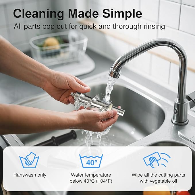 - USER-FRIENDLY: The meat grinder heavy duty has a stainless steel body. Its parts are easy to disassemble for thorough cleaning for food safety. Clean with warm water (<104°F) and a neutral detergent. Please avoid the dishwasher to extend its lifespan