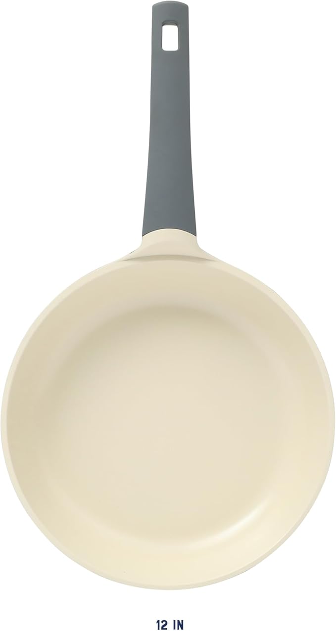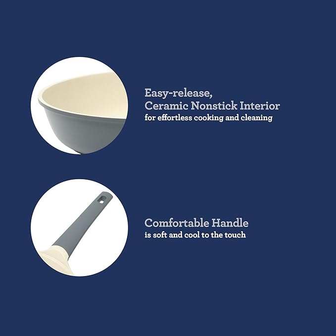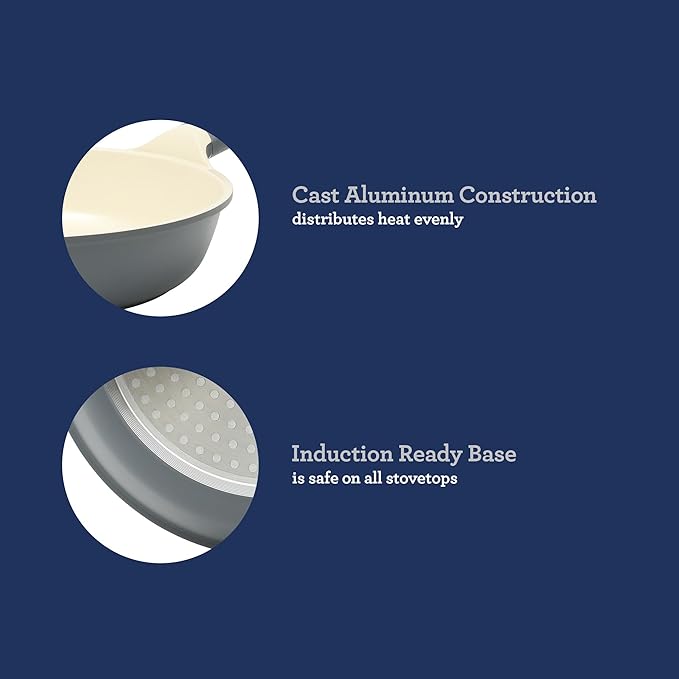 - EASY-RELEASE CERAMIC NONSTICK INTERIOR: Perfect for making new and traditional recipes, this frying pan features a ceramic nonstick interior made without PFOA, PTFE, lead or cadmium. The ceramic coating has an easy-release finish to help prevent leaving crumbs or residue for easier cleanup.